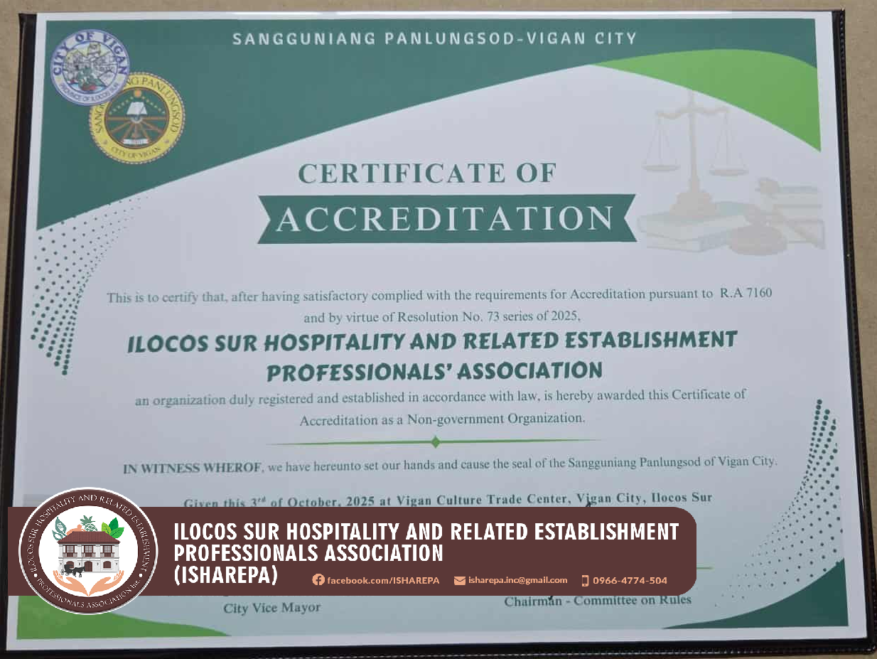 The Ilocos Sur Hospitality And Related Establishment Professionals Association received its Certificate of Recognition representing the Provincial Industry TVET Board for Tourism. This is a testament that our beloved Association is carving a new development that will ensure our industry professionals will benefit and elevate it's knowledge and expertise in their field. Thank you very much TESDA Region I TESDA Ilocos Sur for your entrusting ISHAREPA as your partner in the Hospitality Industry.
